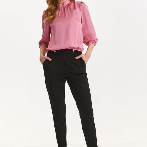 Women's blouse in a loose cut with 3/4-length buffet sleeves finished with a striking elastic band. It has an interesting collar on a stand-up collar with a delicate crease in the front around it, being enriched with a practical elastic at the bottom. It is made of delicate and pleasant to the touch shiny knitwear, being a suitable complement to...