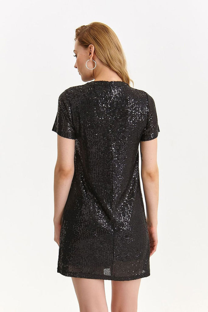 Impressive and filled with unusual elegance mini dress for women with a simple cut and short sleeves finished with delicate stitching. It has a round neckline and a charming teardrop-shaped slit in the middle above the bust, and is made of pleasant-to-touch and delicate knit enriched with shiny sequins throughout. It will prove perfect for a variety of feminine party...