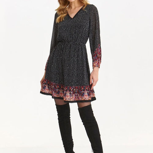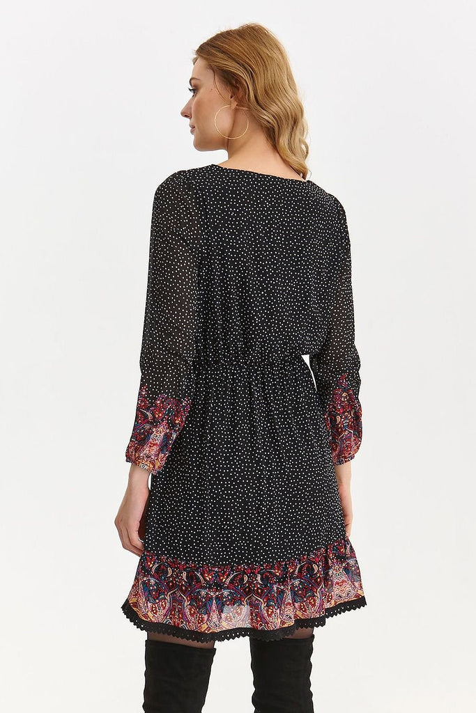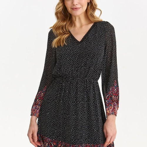 Women's dress with a loose cut and mid-thigh length. It has simple buffet sleeves finished with elastic and a v-neck with decorative lace trim. It has an eye-catching ruffle at the bottom and a practical elastic waistband, and is adorned with an all-over print in delicate dots and colorful insets at the bottom and on the sleeves. It will be...