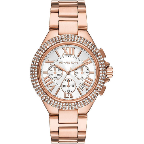Étanchéité: 5 ATM Diamètre du boîtier: 43 mm Public: Femme Matière Bracelet: Acier Inoxydable plaqué or rose Mouvement: Quartz Fonctionnalités: Chronograph - Date Matière Verre: Minéral Type produit: Montre Packaging: Packaging officiel