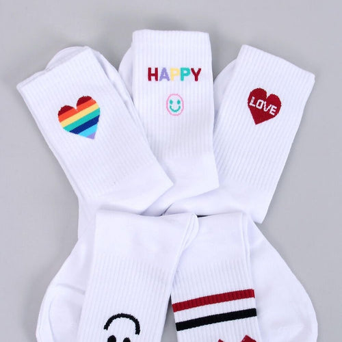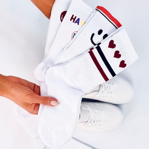 Long women's cotton socks. They have a universal white color and humorous accents that you will surely fall in love with up to your ears : ) They will also be a perfect gift idea.... Cotton 95 % Spandex 5 %