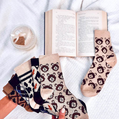 Long women's socks - a set of five pairs. Cute accent - teddy bear will surely steal your hearts : ) They are also perfect for a gift.... They are made of a very nice to the touch combination of cotton and elastin. Cotton 95 % Spandex 5 %