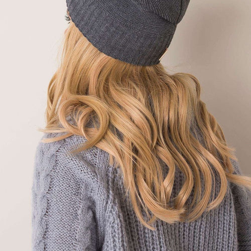 Women's winter beanie with turn-up, decorative plaid weave and pom-pom. Acrylic 70 % wool 30 %