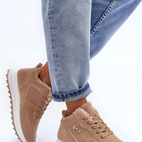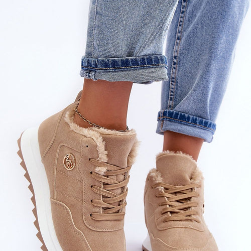 Fur-insulated women's sports shoes. Made of eco leather and set on a platform. On the outer side of the upper a small gold plastic decoration. Classically laced model. fabric artificial leather warmers fur Footbed fur Upper height 7 cm Heel height 5 cm Platform height 3 cm Size Insole lenght 36 22 cm 37 23 cm 38 24 cm 39...