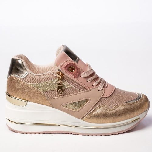 Women's sneakers VELORA PINK are a unique combination of elegance and sporty style. Their pink shade with metallic and glitter accents gives them a luxurious look. The built-in wedge subtly elevates the silhouette, providing comfort throughout the day. The sneakers have practical lacing and a side zipper, making it easy to put them on and adjust to the foot. Perfect...