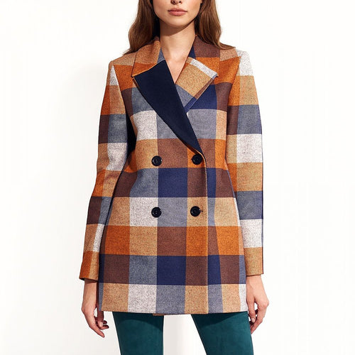 Double-breasted, tight-fitting jacket in autumn colours fits every figure perfectly. This model is slightly longer so it goes well with high-waisted trousers. Looks great even unbuttoned. This jacket definitely draws attention and adds character to styling. Spandex 2.1 % Polyester 74.8 % Viscose 23.1 % Size Total length Chest 36 74.5 cm 96 cm 38 75 cm 100 cm 40...