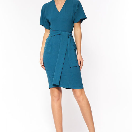 Elegant dress with a tie at the waist should find its place in everyone's closet! Thanks to a V-shaped neckline it lengthens the neck and ties at the waist emphasize the waist. Dress is unlined, perfect for warmer days. Spandex 5 % Polyester 95 % Size Lenght Hips Chest Waist 36 103.5 cm 98 cm 104 cm 71 cm 38...