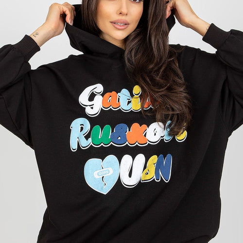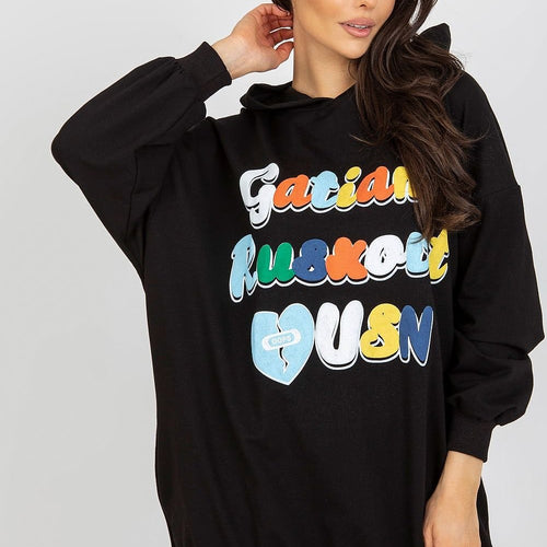 Women's sweatshirt with a simple cut, long sleeves and a hood. On the sides there are slip pockets. Decorative inscription on the front. Cotton 65 % Spandex 35 % Size Total length Chest one-size-fits-all 80 cm 136 cm