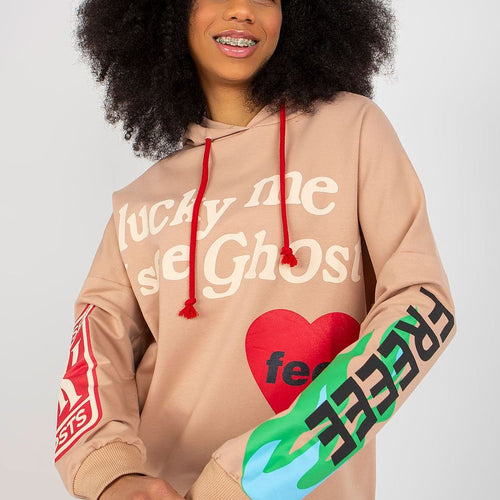 Women's sweatshirt with a simple cut, long sleeves and a hood. On the sides there are slip pockets. Decorative lettering on the front and sleeves. Cotton 65 % Spandex 35 % Size Total length Chest one-size-fits-all 72 cm 128 cm