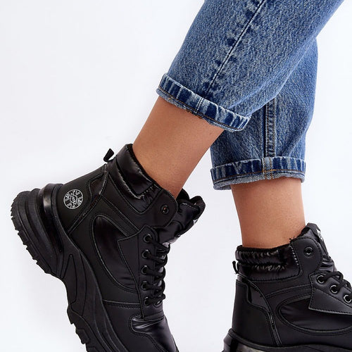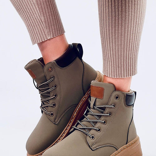 Women's lace-up boots - trekking trappers on a protector. Note their iconic cut with a shiny application on the top of the upper. Not only do they look great, they are also mega comfortable! They are made of organic leather, and the interior is insulated with cuddly, soft fur. fabric artificial leather warmers soft fur Heel height 4 cm Sole...