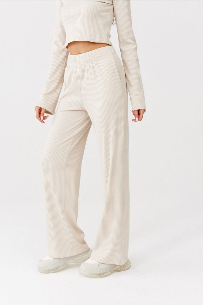 Women's pants with straight wide legs, valued for their relaxed style. Featuring practical side pockets and a wide elastic waistband, they are perfect for a variety of feminine autumn and winter outfits. They are made of pleasant to the touch and good quality knitwear, appreciated for their softness and durability. They can be successfully used both as an element of...