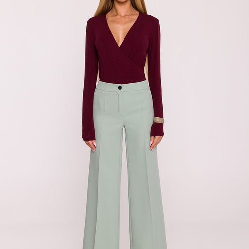 Elegant women's trousers made of smooth suit fabric with a matte finish are a proposal that combines classic with modern style. The material is light, drapes well on the silhouette, and emphasizes the fitted cut. The high-waisted model beautifully accentuates the waist and visually elongates the figure. The trousers have long, flared legs, and the stylish pleats at the front...