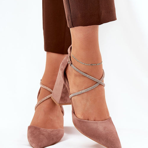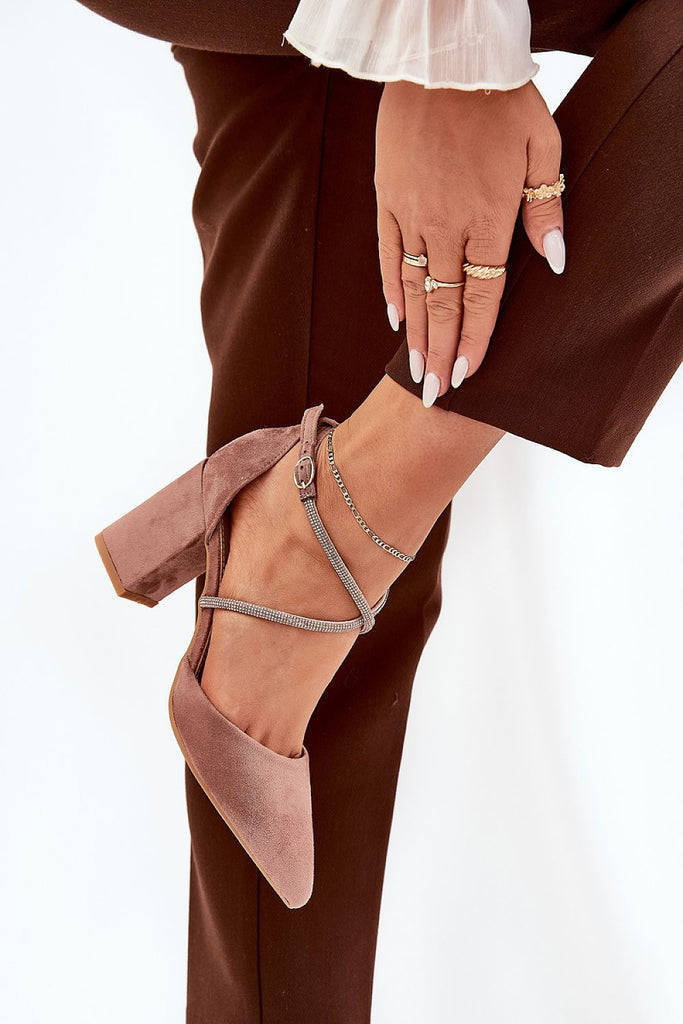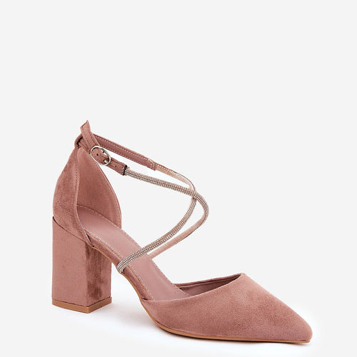 Women's pumps made of eco suede. Set on a column heel. This model is distinguished by interlacing straps, which are adorned with zircons that will surely attract attention and give a unique shine. Pointed toes emphasize their elegant look, and fastened with a buckle, they ensure a perfect fit to the foot. These pumps will be a perfect choice for...
