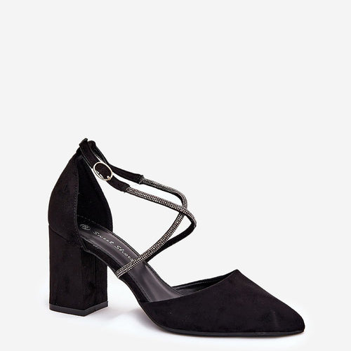 Women's pumps made of eco suede. Set on a pillar type heel. This model stands out with interwoven straps, which are adorned with zircons that will surely attract attention and give a unique shine. Pointed toes emphasize their elegant appearance, and fastened with a buckle, they ensure a perfect fit to the foot. These pumps will be an excellent choice...