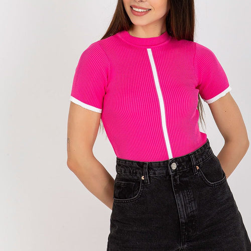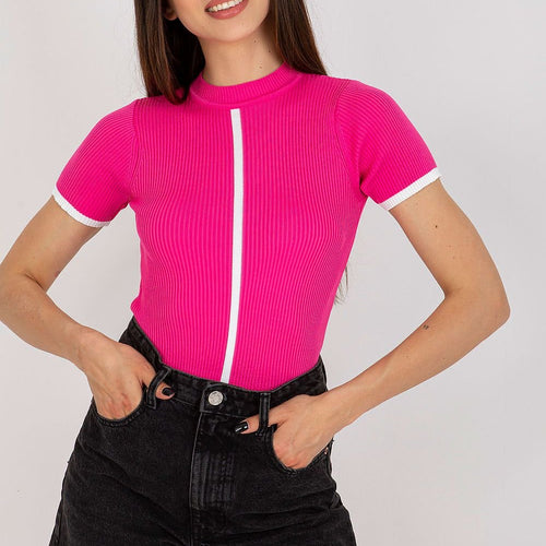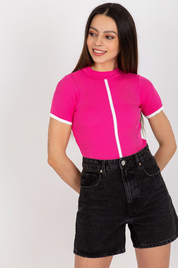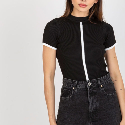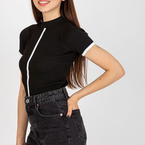 Blouse of ribbed fabric with short sleeves and a half turtleneck. A proposal ideal for everyday wear. The material is very stretchy. Polyester 100 % Size Total length Chest one-size-fits-all 57 cm 52 cm