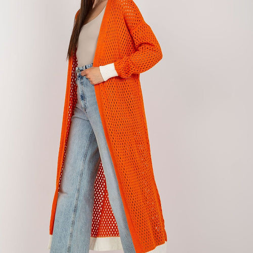 Openwork long sleeve cardigan, unbuttoned. Sleeves and hem finished with contrasting color. Acrylic 70 % wool 30 % Size Total length Chest one-size-fits-all 137 cm 116 cm