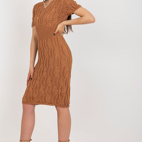 Knitted pencil cut dress with short sleeves and a heart neckline. A proposition ideal for everyday wear. Cotton 60 % Polyester 40 % Size Total length Chest one-size-fits-all 98 cm 110 cm