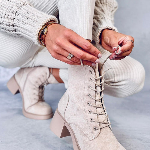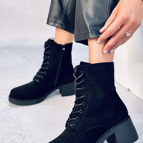 Lace-up women's boots on a wide heel with a height of 6 cm. They are made of very pleasant to the touch organic suede, which emphasizes their unique style. The model is entirely traditionally laced, but also has a practical zipper closure, which makes it easy to put on. Do not be persuaded any longer : ) The interior of...