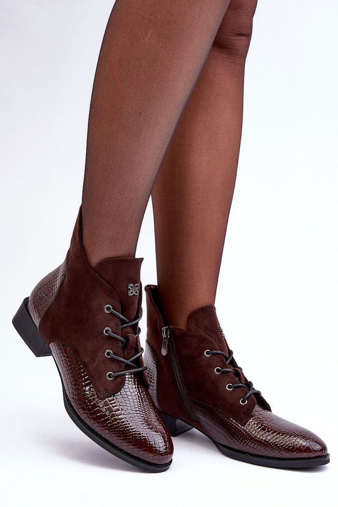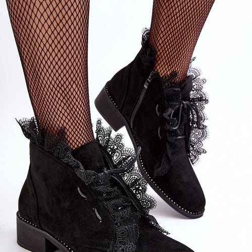 Women's boots with ankle-length upper. Set on a flat heel. Rounded toe-caps. Zippered at the side and additional lacing at the front. Interior insulated with shoe blanket. The upper decorated with lace. In addition, this model has a stiffened heel counter. fabric imitation leather suede warmers shoe cover Footbed shoe cover Upper height 10.5 cm Heel height 4 cm Size...