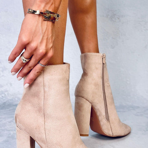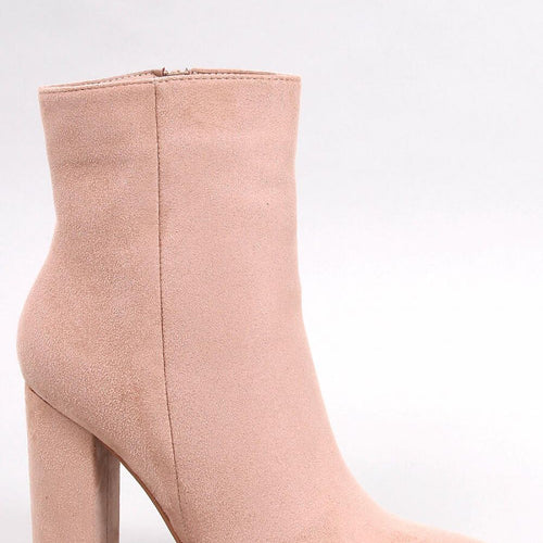 Booties made of organic suede leather. Fastened with a zipper on the inside. Set on a medium height post. Upper above the ankle on the outside decorated with an elastic rubber insert and a thin strap finished with a buckle. Lightly insulated inside. Comfortable, classic boots will complement many autumn stylings. fabric imitation leather suede warmers fur Footbed fur Upper...