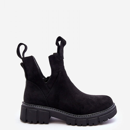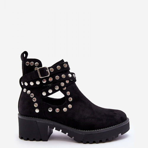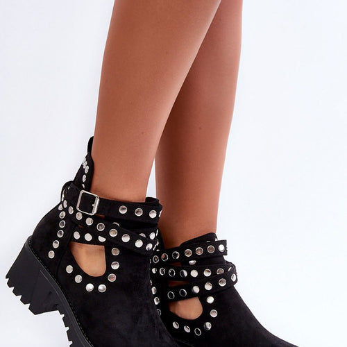 Classic women's boots were made of eco-suede. In addition, the boots have been decorated with studs. These boots are slip-on and have a strap fastened with a buckle. Fashionable cutouts on the sides characterize this model. The boots are set on a flat heel and a platform. fabric imitation leather suede Footbed artificial leather Upper height 12.5 cm Heel height...