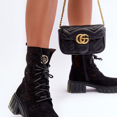 Beautiful ankle boots were made of eco-suede with an openwork pattern. They are zippered on the side of the upper and additionally laced. The boots have a stiffened heel counter and a decoration on the tongue. The ankle boots are set on a massive flat heel and platform, which will protect against cold ground. fabric imitation leather suede Footbed artificial...