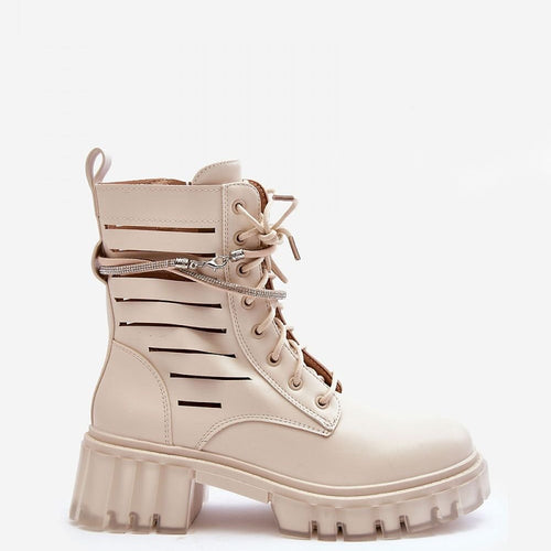 Unusual and stylish boots made of eco leather. They are zippered on the side of the upper and additionally laced. The boots have a stiffened heel counter. The decorative, detachable strap is enriched with rhinestones imitating zircons. The boots were made of eco leather with fashionable cuts. They were set on a massive flat heel and platform. fabric artificial leather...