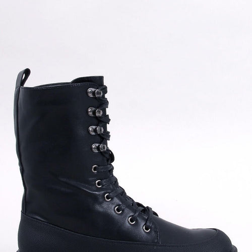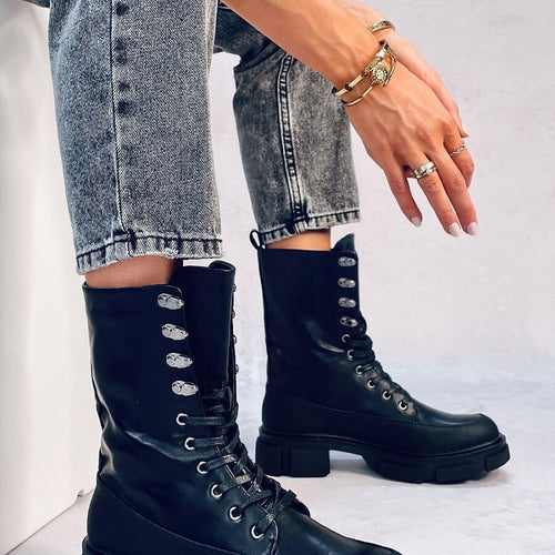 Women's boots ? glans in military style. Classically laced, so you can perfectly adjust them to the tenacity of the foot, and the thick sole provides great insulation from the ground. Shoes in a universal black color are always an excellent choice! They are made of organic leather, on a foam lining. fabric artificial leather warmers foam padding Heel height...