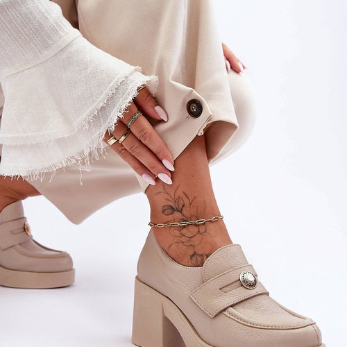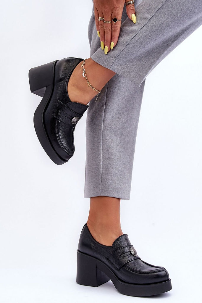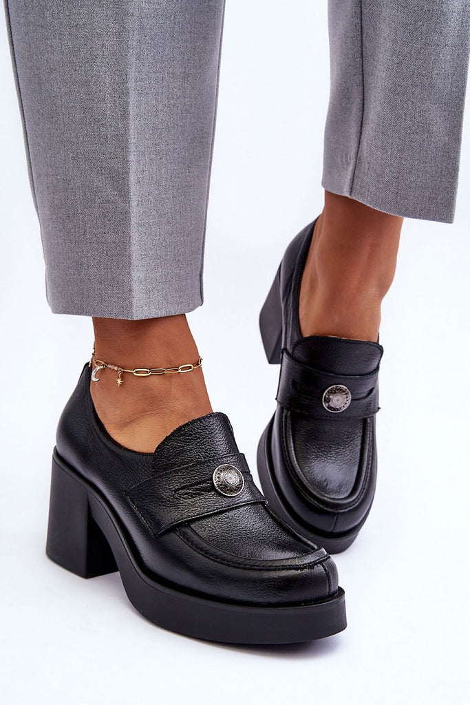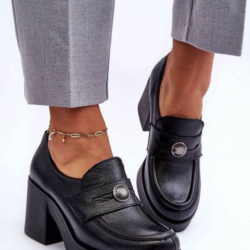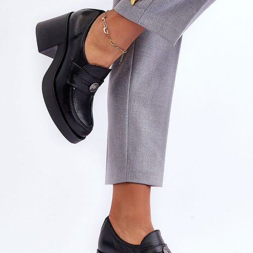 Women's heeled half shoes with an upper made of natural leather. The interior is also covered with natural leather, thanks to which they are very comfortable to wear. The stylish heel in the form of a wide post will provide stability at every step. In addition, under the tongue there is a tightening elastic band, which will make the shoe...