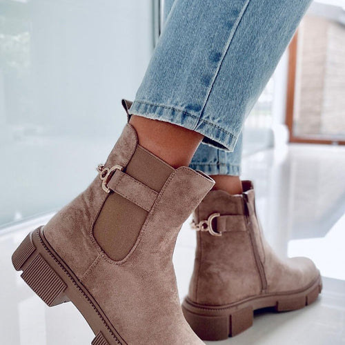 Women's suede slippers on a thick sole. They have a timeless cut with an elastic insert on the side and a practical zipper closure. The most fashionable accent is the chain at the back of the upper, which gives the shoes character. Don't wait and order them now! They are made of eco-suede, and the interior is lined with soft...