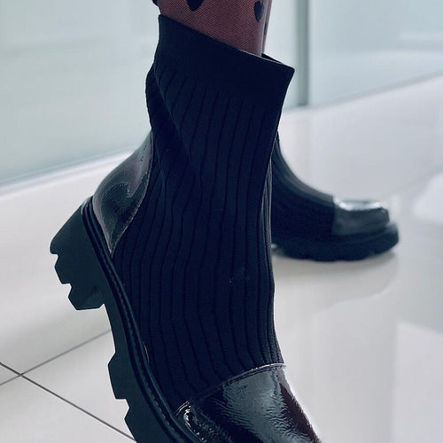 Women's boots on a thick sole. They perfectly fit into the trends of this season! They are made of the most fashionable stretch fabric, thanks to the check they perfectly fit the leg.... Lacquered inserts will attract the eyes, so do not be persuaded any longer : ) Outer material - fabric + ecological leather lacquered. fabric ~tkanina + skóra...