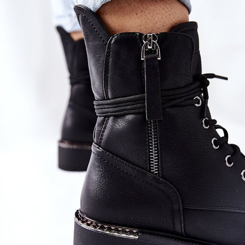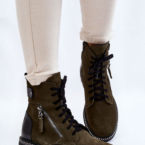 The classic women's boots were made of high-quality natural leather. This model has a zipper on the side of the upper and solid lacing. The boots are set on a flat heel with grooves and a non-slip sole. Inside they are insulated with a shoe blanket. The stiffened heel counter will ensure proper stabilization of the foot. fabric ~skóra naturalna...