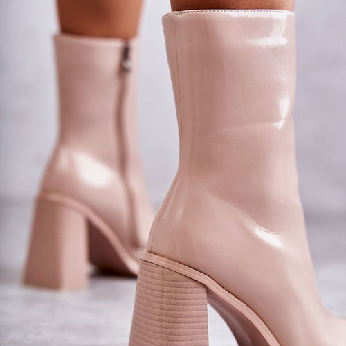Wonderful boots made of lacquered eco leather will steal the heart of many a lover of high heels! Model with an upper to the middle of the calf. Fastened on the side with a zipper. Set on a stiletto heel. Inside they are insulated with a nice-to-touch shoe blanket. In addition, the heel counter is padded. You can not miss...