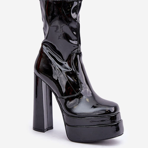 Stylish women's patent ankle boots, set on a high column heel and platform that provide comfort and stability. The model with rounded toes, fastened with a zipper for easy putting on. Lined at the height of the foot, perfect for cooler days. This model will complement various stylizations perfectly. fabric artificial leather warmers fabric Footbed shoe cover Upper height 19...