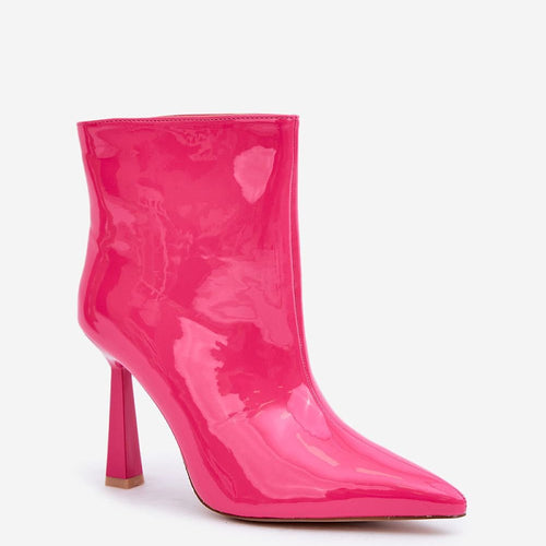 Women's high-heeled patent leather ankle boots. Model with pointed toes, which visually slims the foot. Lined with shoe fleece, they will work perfectly on colder days. Ideal for styling for special occasions. fabric artificial leather warmers shoe cover Footbed shoe cover Upper height 11.5 cm Heel height 10 cm Size Insole lenght 36 23.5 cm 37 24 cm 38 24.5...