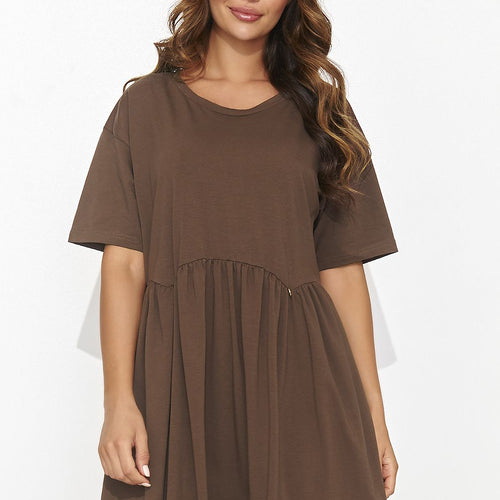 A casual mini dress with a unique charm, with an elegant gold bling sewn on the front. The creation, with short sleeves and a casual cut, exudes girlish charm. The round neckline perfectly emphasizes the carefree look, adding lightness and casualness. This dress, available in several colors, is the perfect choice for everyday wear, adding a touch of style to...