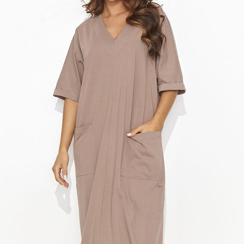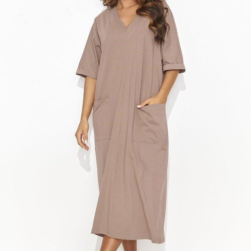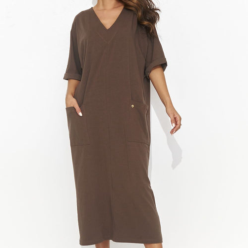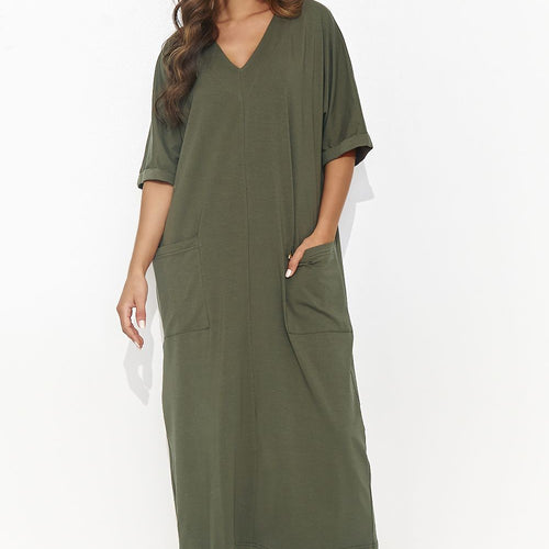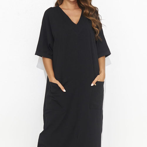A long, casual dress with short sleeves and a heart neckline, perfectly combining comfort with classic everyday elegance. The dress has two practical pockets on the front, and at one of them an additional accent in the form of a gold plate, giving it a delicate shine. Simple and elegant, this dress is the perfect choice for everyday comfort and...