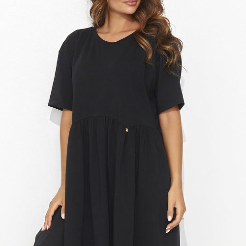 A casual mini dress with a unique charm, with an elegant gold bling sewn on the front. The creation, with short sleeves and a casual cut, exudes girlish charm. The round neckline perfectly emphasizes the carefree look, adding lightness and casualness. This dress, available in colors, is the perfect choice for everyday wear, adding a touch of style to everyday...