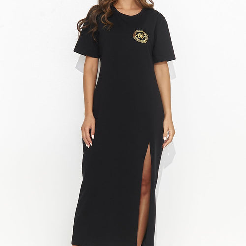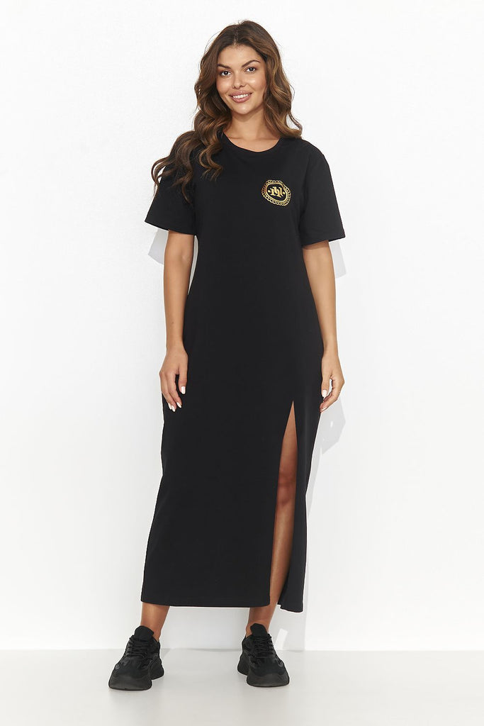A maxi dress with a long front slit is a modern and timeless option for women who appreciate comfort and style. Made of fine sweatshirt knit, this casual creation is not only comfortable, but also very fashionable. The dress has two appliqués: one smaller one on the front and a larger one located on the back line, which adds to...