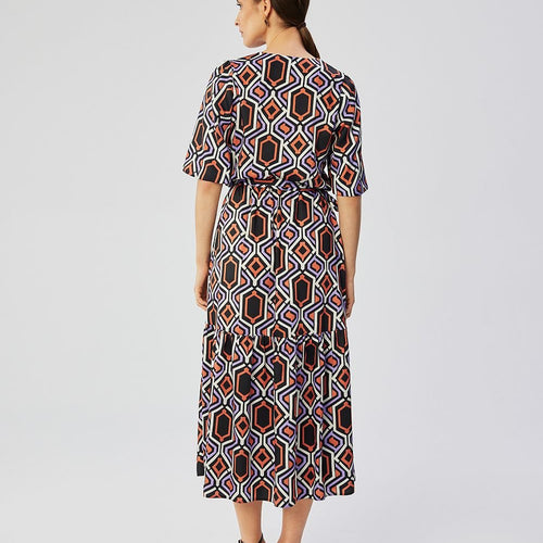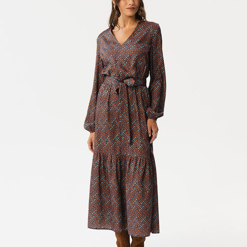 This maxi length dress is a combination of elegance and comfort. Its geometric pattern gives it originality and character. The V-shaped neckline is elegant and classic. The elastic waistband and attached tie belt accentuate the waist while providing comfort. At the bottom of the dress, an attached ruffle adds lightness and mobility. Long sleeves finished with elastic are both fashionable...