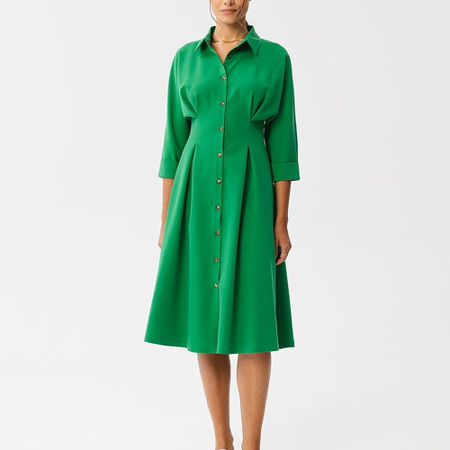 Introducing a charming dress that stands out for its unique style. Made of durable fabric, it is not only comfortable, but also elegant. The dress has a collar, which adds to its class. The button closure is not only practical, but also gives the dress a chic look. Its blushed cut with waist pleats accentuates the silhouette and gives it...
