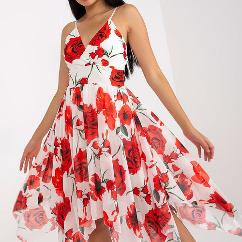 Summer dress with adjustable straps. Envelope neckline with sewn-in padded cups. Asymmetrical blown-out bottom. The dress has a lining. Spandex 5 % Polyester 50 % Viscose 45 % Size Total length Chest one-size-fits-all 85/113 cm 76 cm