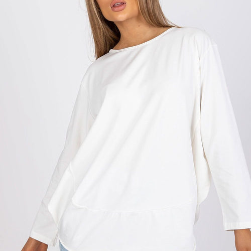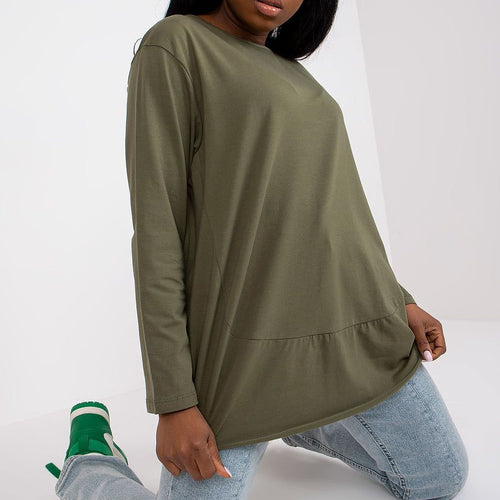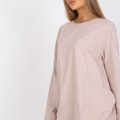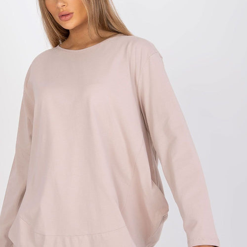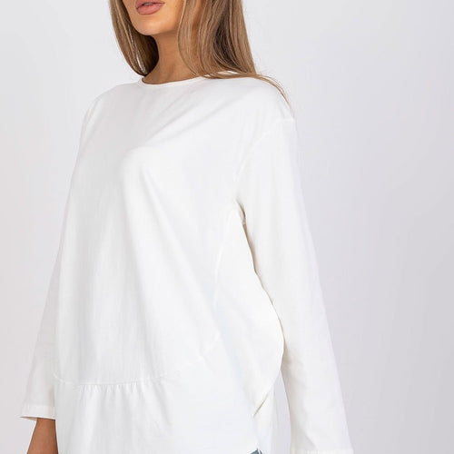 Women's blouse with long sleeves and a round neckline. The blouse has a loose cut with a half-round bottom. Cotton 90 % Spandex 10 % Size Total length Chest one-size-fits-all 81 cm 114 cm