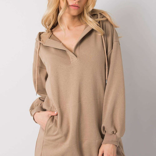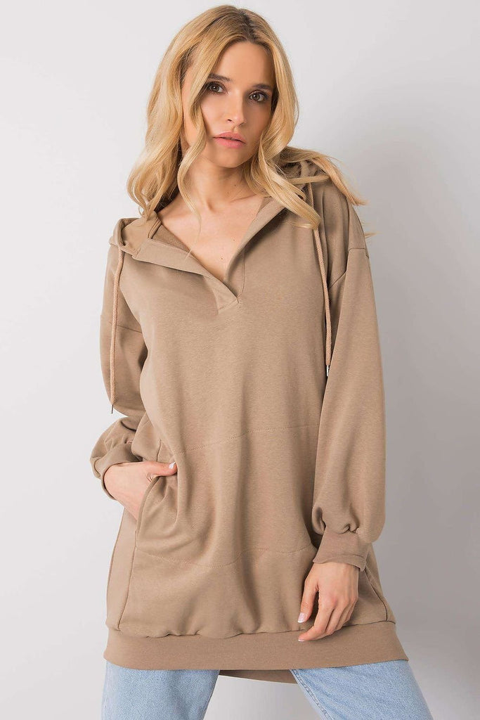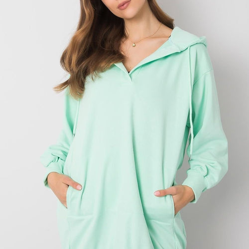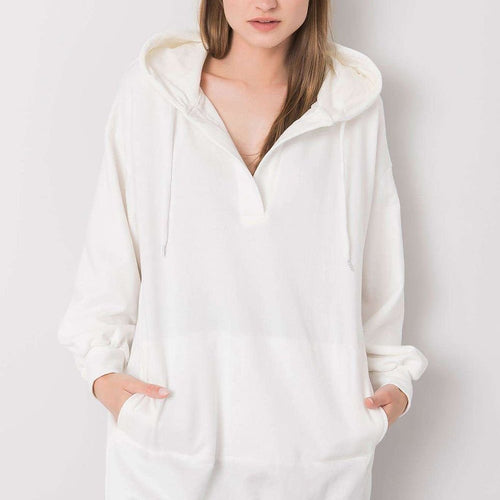 Women's sweatshirt of an extended cut with a hood. On the front a kangaroo type pocket. Ideal proposal for everyday and not only. Cotton 70 % Polyester 30 % Size Chest M 86 cm S 82 cm