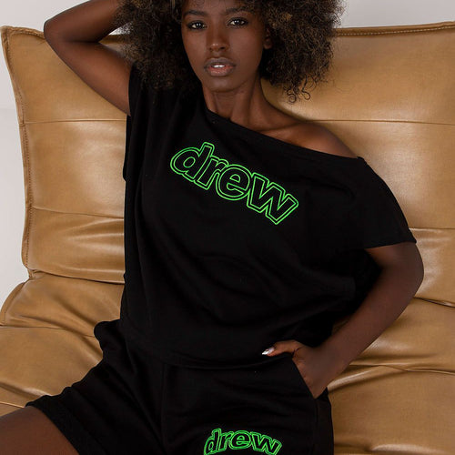 Tracksuit set consisting of a blouse and shorts. Blouse with short sleeves, boat neckline. Shorts with high waist, side slant pockets, waistband with elastic band and ties. Cotton 90 % Spandex 10 % Size Lenght Chest Waist one-size-fits-all 54/39 cm 118 cm 66 cm