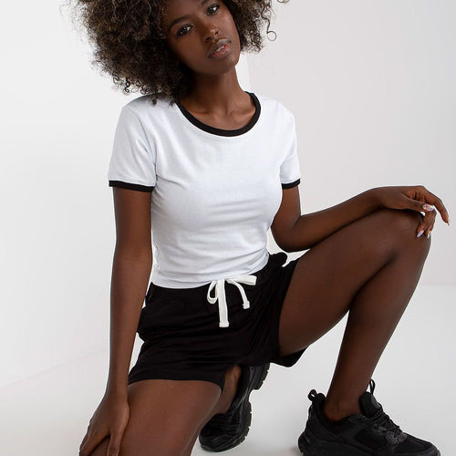 Ladies set consisting of a t-shirt and shorts. T-shirt with short sleeves, round neckline. High waisted shorts with slip pockets on the sides. Shorts with elastic waistband and ties. Cotton 90 % Spandex 10 % Size Lenght Chest Waist one-size-fits-all 46/39 cm 80 cm 70 cm