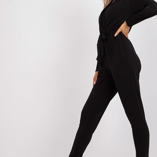 Ladies' long-sleeved jumpsuit. Envelope front with a tie at the waist. Ideal for everyday and not only. Spandex 10 % Polyester 90 % Size Total length Chest one-size-fits-all 138 cm 92 cm