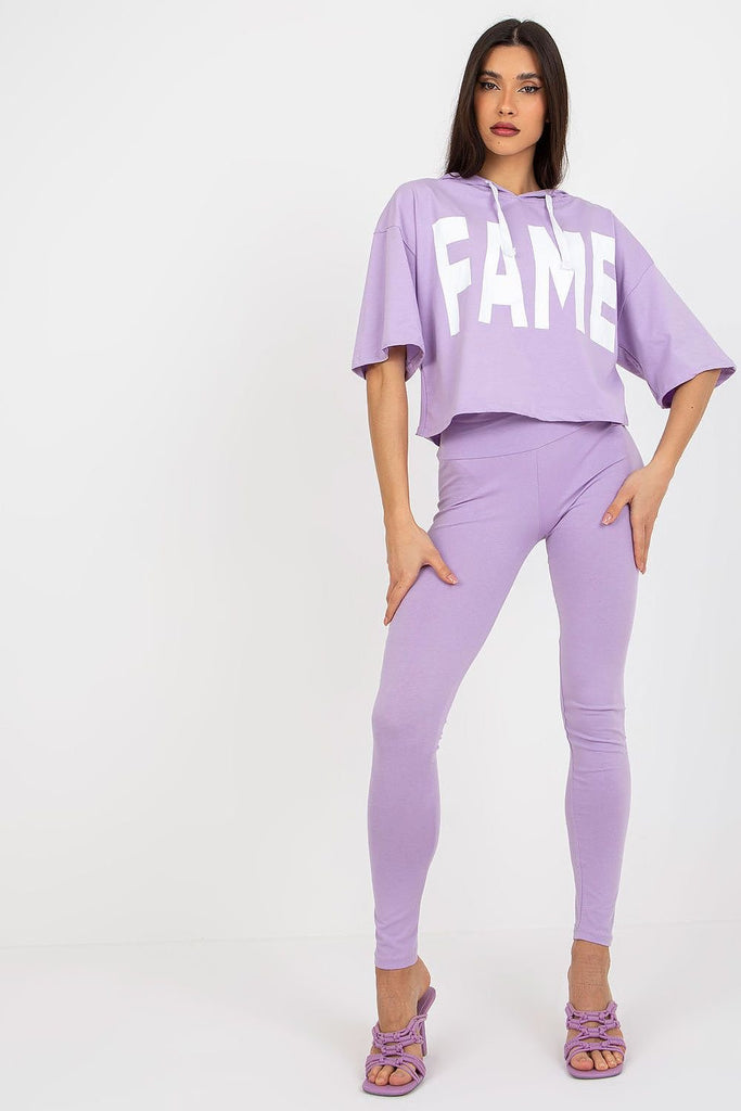 A sweatshirt set consisting of a sweatshirt and leggings. Sweatshirt of a loose cut with short sleeves and a hood. Long leggings with wide elastic waistband. Set with decorative inscriptions. Cotton 90 % Spandex 10 % Size Lenght Chest Waist one-size-fits-all 48/96 cm 108 cm 62 cm