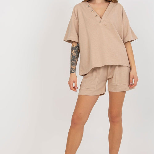 Tracksuit set consisting of a blouse and shorts. Blouse with short sleeves and a heart neckline. Shorts with waist tie and slip pockets. Cotton 70 % Polyester 30 % Size Lenght Chest Waist one-size-fits-all 62/38 cm 114 cm 68 cm