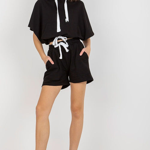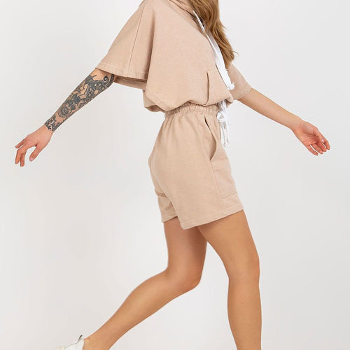 Tracksuit set consisting of a blouse and shorts. Blouse with short wide sleeves, hood and kangaroo pocket. Shorts with waist tie and slip pockets. Cotton 70 % Polyester 30 % Size Lenght Chest Waist one-size-fits-all 55/41 cm 134 cm 68 cm